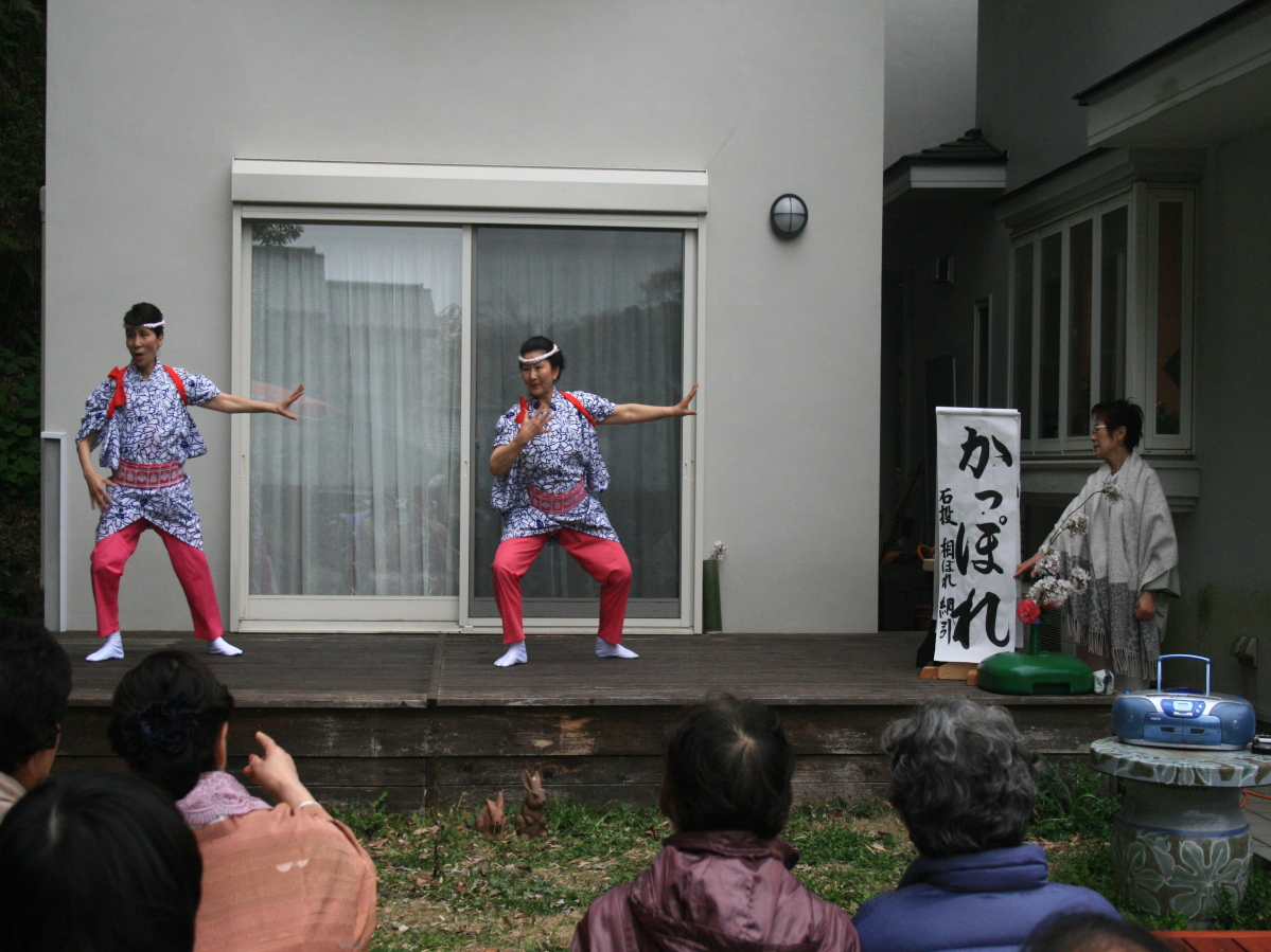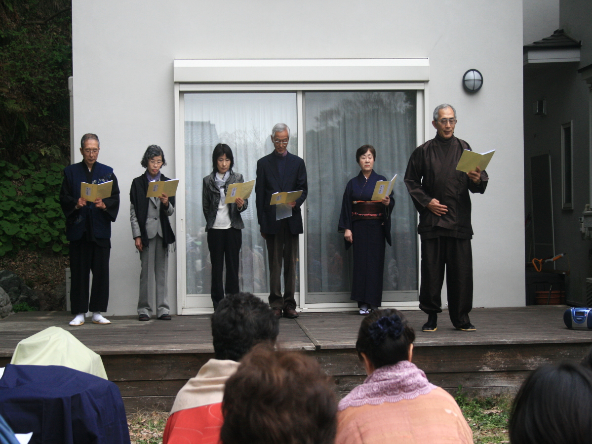 | 桜の花も例年より早めの満開のようでしたが、朝から大変寒い日でした。 今回は手旗もできて、混み合っている鎌倉駅 でも目だっていました。 参加者は、準備で直接会場参加も含め12名です。野点参加の皆様は25名でした。 歩いて、大巧寺を抜け、本覚寺、妙本寺など少しだけ見て、八雲神社へ。鎌倉は狭い中に多くの史跡があるため、説明 しながらでは中々前に進めません。 八雲神社から、祇園山ハイキングコースへと進みます。最初は急な登り道ですが、展望台をすぎてからは平坦になりま す。鎌倉のハイキングコースの中では、短いですが、急な箇所が多いようです。 途中で、軽いお昼を食べ、腹切りやぐら から、東勝寺橋を通り、宝戒寺、大倉幕府跡を見て、歩いてレインボーステイへと向かいました。 すでに野点の準備もできあがり、順番に野点のお茶とお菓子を味わいました。 その後、詩吟の朗詠、かっぽれと続きま した。 寒い中大変でしたが、貴重な経験を楽しむことができました。 ありがとうございました。 |